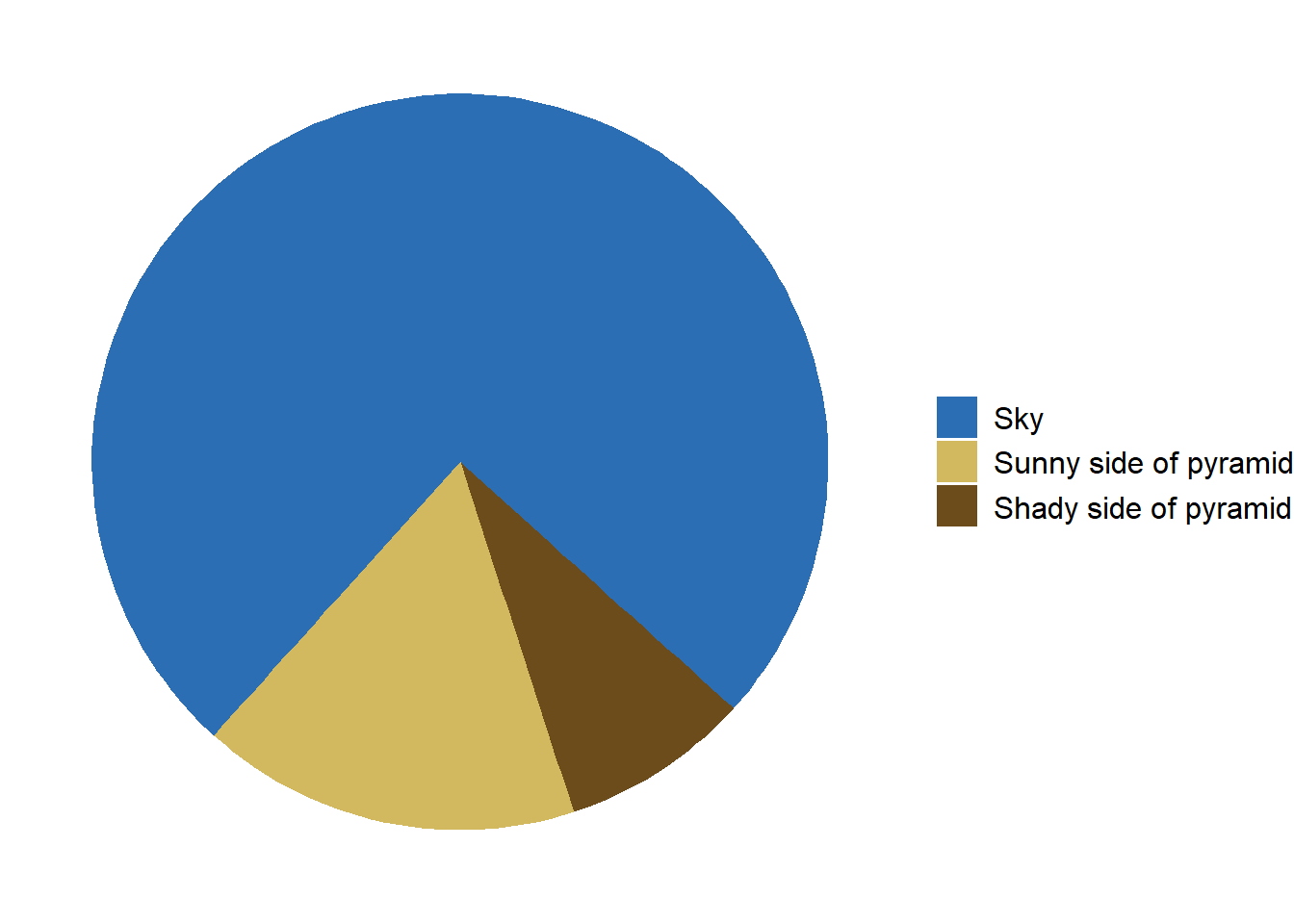 library(ggplot2)# Data preparationdata <-data.frame(category =c("Sky", "Sunny side of pyramid", "Shady side of pyramid"),value =c(3/4, 1/6, 1/12) # Adjusted proportions for the pie chart)# Create the pie chart with corrected orientation and proportionsggplot(data, aes(x ="", y = value, fill =factor(category, levels =c("Sky", "Sunny side of pyramid", "Shady side of pyramid")))) +geom_bar(width =1, stat ="identity") +coord_polar(theta ="y", start =11*pi/15) +# Adjust the start angle to place the pyramid at the bottomscale_fill_manual(values =c("Sky"="#2b6eb4", "Sunny side of pyramid"="#d2b95f","Shady side of pyramid"="#6b4c1a")) +theme_void() +theme(legend.position ="right",legend.title =element_blank(),legend.text =element_text(size =12))
