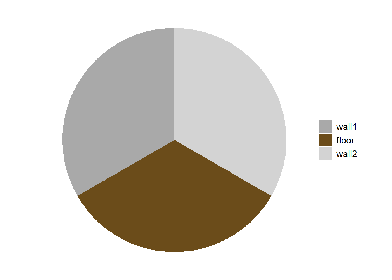 library(ggplot2)# Data preparationdata <-data.frame(category =c("wall1", "floor", "wall2"),value =c(1/3, 1/3, 1/3) # Adjusted proportions for the pie chart)# Create the pie chart with corrected orientation and proportionsggplot(data, aes(x ="", y = value, fill =factor(category, levels =c("wall1", "floor", "wall2")))) +geom_bar(width =1, stat ="identity") +coord_polar(theta ="y", start =0) +# Adjust the start anglescale_fill_manual(values =c("wall1"="darkgrey", "floor"="#6b4c1a","wall2"="lightgrey")) +theme_void() +theme(legend.position ="right",legend.title =element_blank(),legend.text =element_text(size =12))