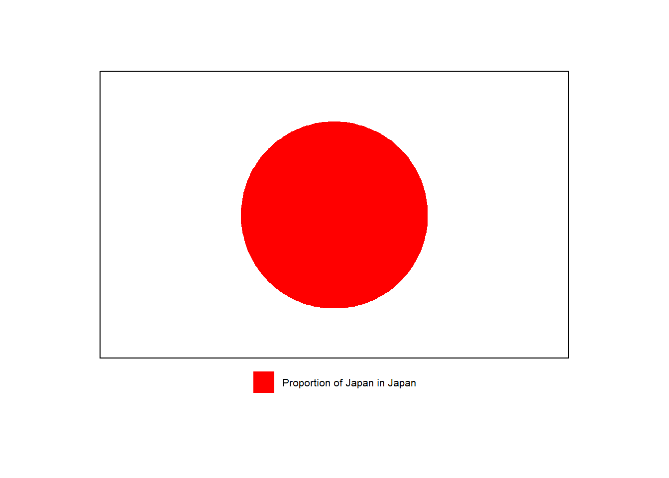 library(ggplot2)library(gridExtra)library(grid)# Data preparationdata <-data.frame(category =c("Proportion of Japan in Japan"),value =c(1) # Adjusted proportions for the pie chart)# Create the pie chart without the legendp <-ggplot(data, aes(x ="", y = value, fill = category)) +geom_bar(width =1, stat ="identity") +coord_polar(theta ="y", start =0) +# Adjust the start anglescale_fill_manual(values =c("red")) +theme_void() +theme(legend.position ="none",plot.margin =margin(t =20, r =20, b =20, l =20)#,# aspect.ratio = 1 # Adjust aspect ratio to make it wider )# Create a separate plot for the legendlegend <-ggplot(data, aes(x ="", y = value, fill = category)) +geom_bar(width =1, stat ="identity") +scale_fill_manual(values =c("red")) +theme_void() +theme(legend.position ="none",plot.margin =margin(t =20, r =20, b =20, l =20) )# Create a separate plot for the legendlegend <-ggplot(data, aes(x ="", y = value, fill = category)) +geom_bar(width =1, stat ="identity") +scale_fill_manual(values =c("red")) +theme_void() +theme(legend.position ="bottom",legend.title =element_blank(),legend.text =element_text(size =8),plot.margin =margin(t =0, r =0, b =0, l =0) )# Extract the legendg_legend <-function(a.gplot) { tmp <-ggplot_gtable(ggplot_build(a.gplot)) leg <-which(sapply(tmp$grobs, function(x) x$name) =="guide-box") legend <- tmp$grobs[[leg]]return(legend)}legend_grob <-g_legend(legend)# Create the borderborder_grob <-rectGrob(gp =gpar(fill =NA, col ="black", lwd =1))# Arrange the pie chart and legend with the borderpie_with_border <-gTree(children =gList(ggplotGrob(p), border_grob))# Combine the pie chart with border and the legendcombined_plot <-arrangeGrob( pie_with_border, legend_grob,ncol =1,heights =c(6, 1))# Display the final plotgrid.newpage()pushViewport(viewport(width =0.7, height =0.7)) # Adjusting the viewport size for landscape orientationgrid.draw(combined_plot)