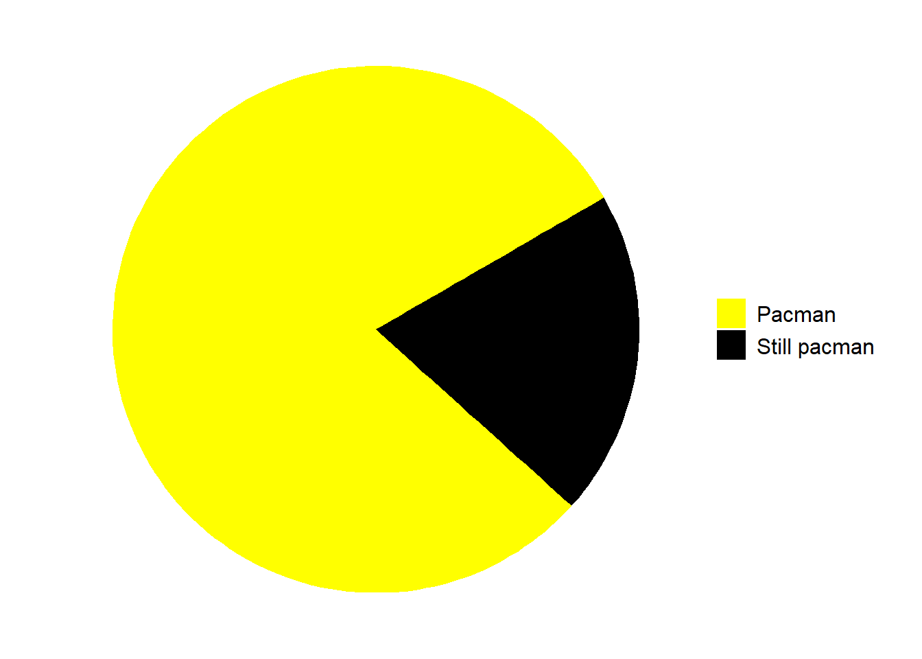 library(ggplot2)# Data preparationdata <-data.frame(category =c("Pacman", "Still pacman"),value =c(4/5, 1/5) # Adjusted proportions for the pie chart)# Create the pie chart with corrected orientation and proportionsggplot(data, aes(x ="", y = value, fill = category)) +geom_bar(width =1, stat ="identity") +coord_polar(theta ="y", start = pi/3) +# Adjust the start angle to place the pyramid at the bottomscale_fill_manual(values =c("Pacman"="yellow", "Still pacman"="black")) +theme_void() +theme(legend.position ="right",legend.title =element_blank(),legend.text =element_text(size =12))