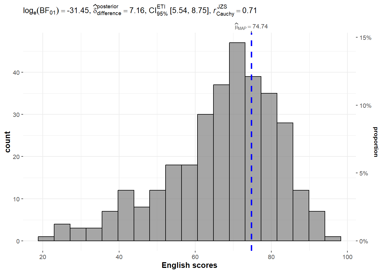 In the code chunk below, gghistostats() is used to to build an visual of one-sample test on English scores.