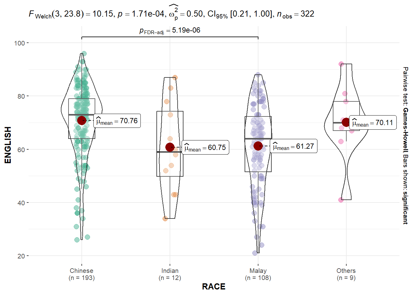 In the code chunk below, ggbetweenstats() is used to build a visual for One-way ANOVA test on English score by race.