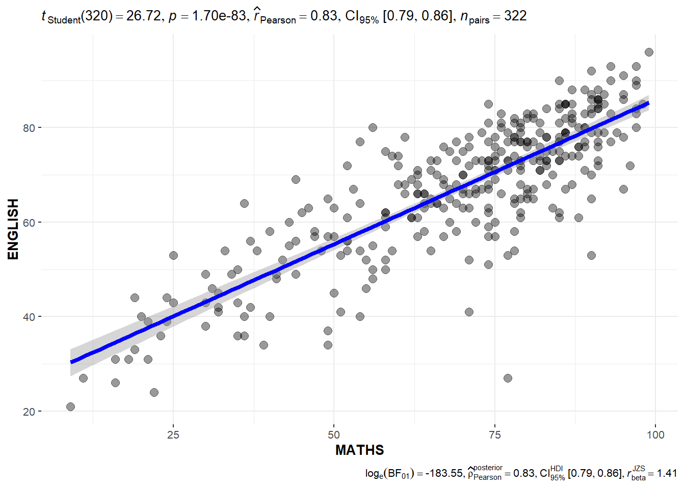 In the code chunk below, ggscatterstats() is used to build a visual for Significant Test of Correlation between Maths scores and English scores.