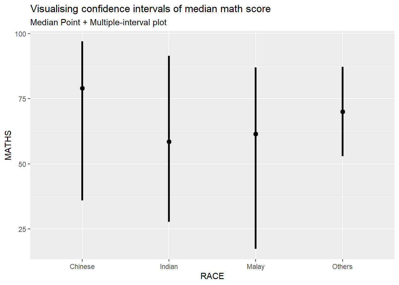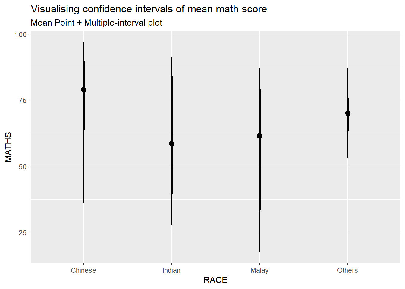 Instead of plotting the standard error bar of point estimates, we can also plot the confidence intervals of mean maths score by race.