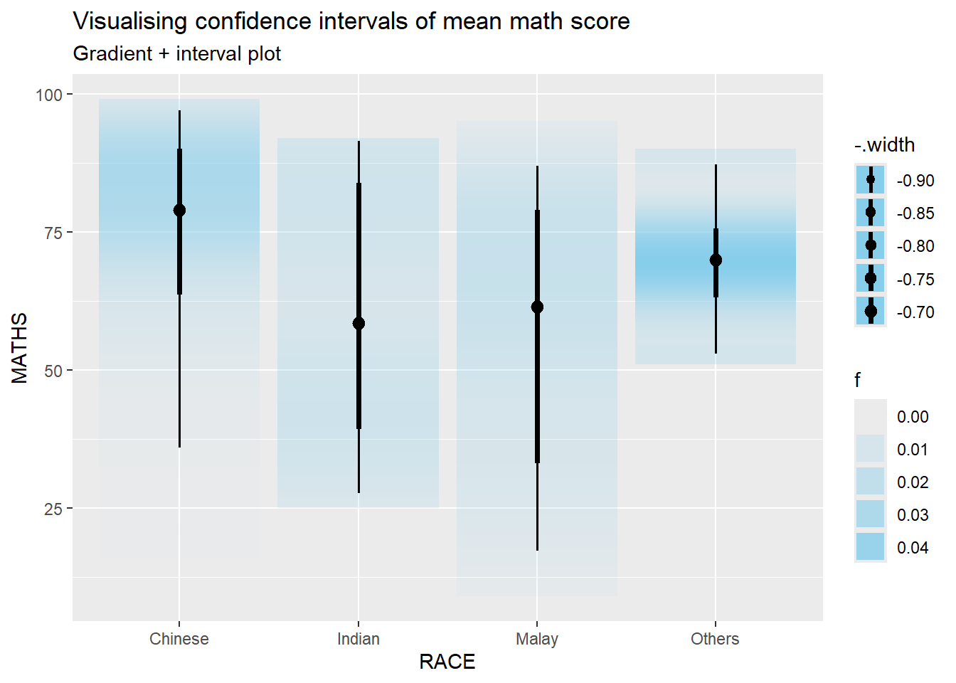 In the code chunk below, stat_gradientinterval() of ggdist is used to build a visual for displaying distribution of maths scores by race.