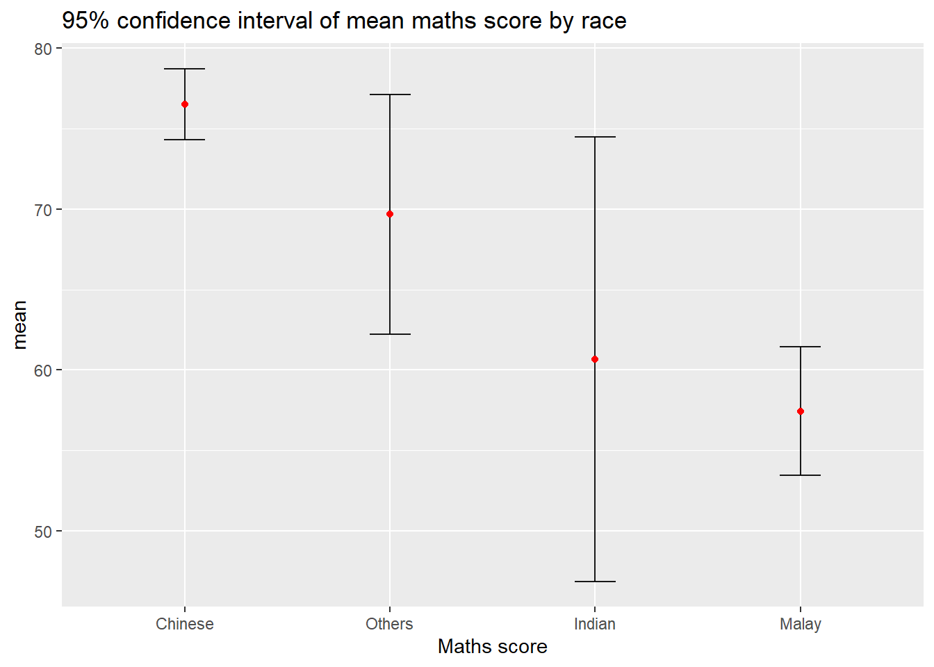 Important Don’t confuse the uncertainty of a point estimate with the variation in the sample In this section, you will learn how to plot error bars of maths scores by race by using data provided in exam tibble data frame.