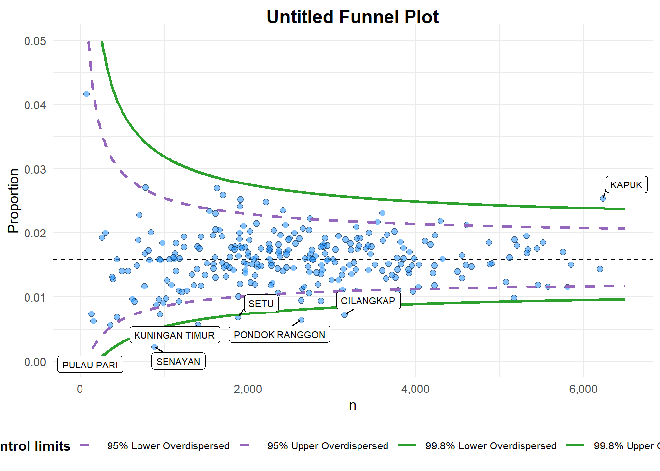 FunnelPlotR package uses ggplot to generate funnel plots. It requires a numerator (events of interest), denominator (population to be considered) and group. The key arguments selected for customisation are: