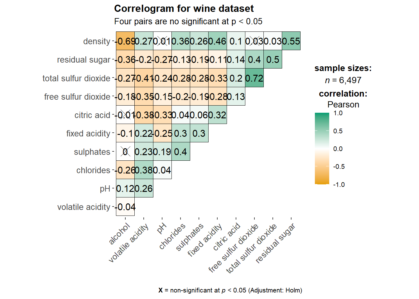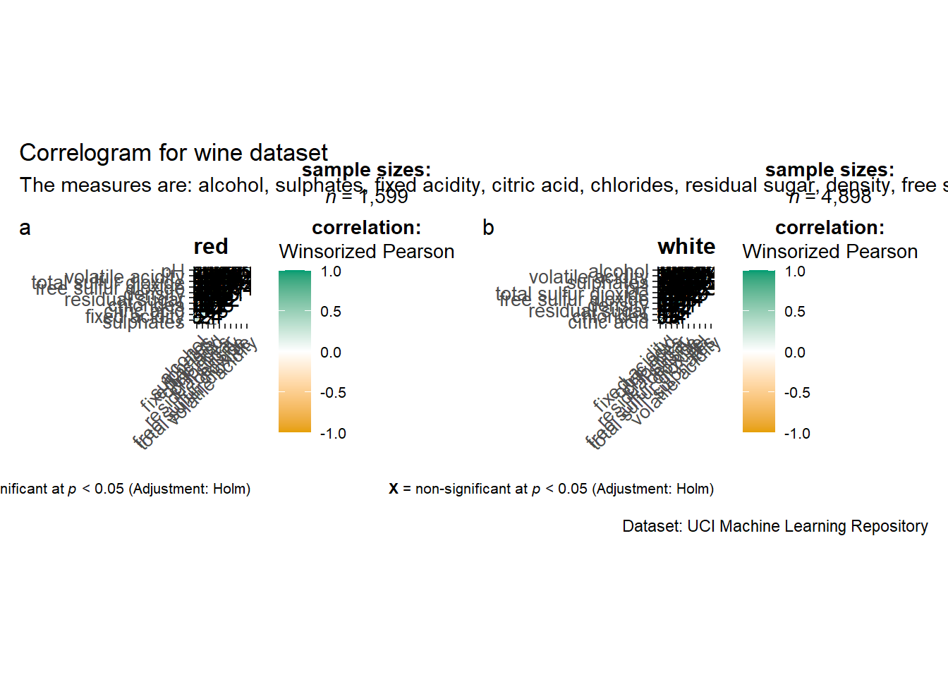 The basic plot On of the advantage of using ggcorrmat() over many other methods to visualise a correlation matrix is it’s ability to provide a comprehensive and yet professional statistical report as shown in the figure below.