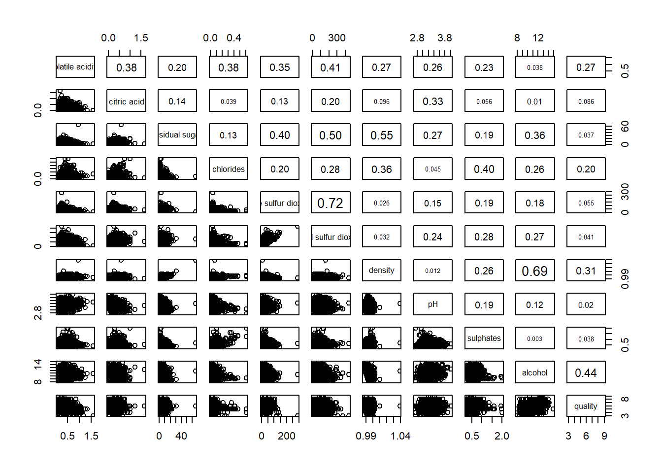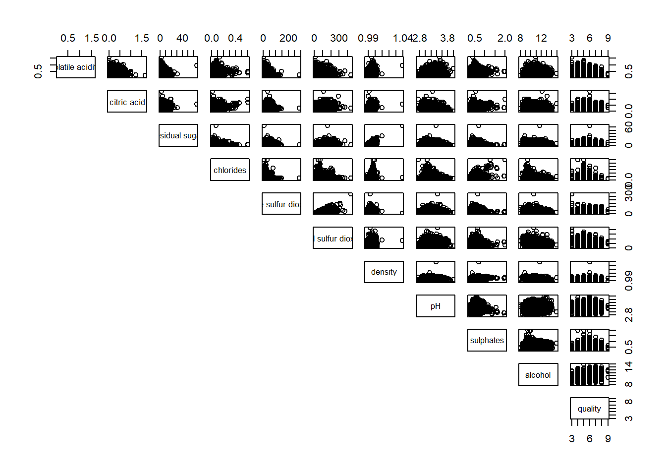 Figure below shows the scatter plot matrix of Wine Quality Data. It is a 11 by 11 matrix.