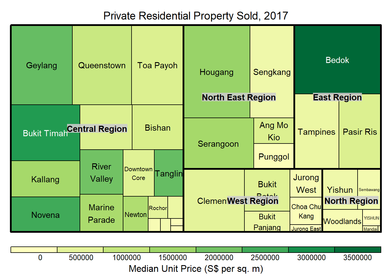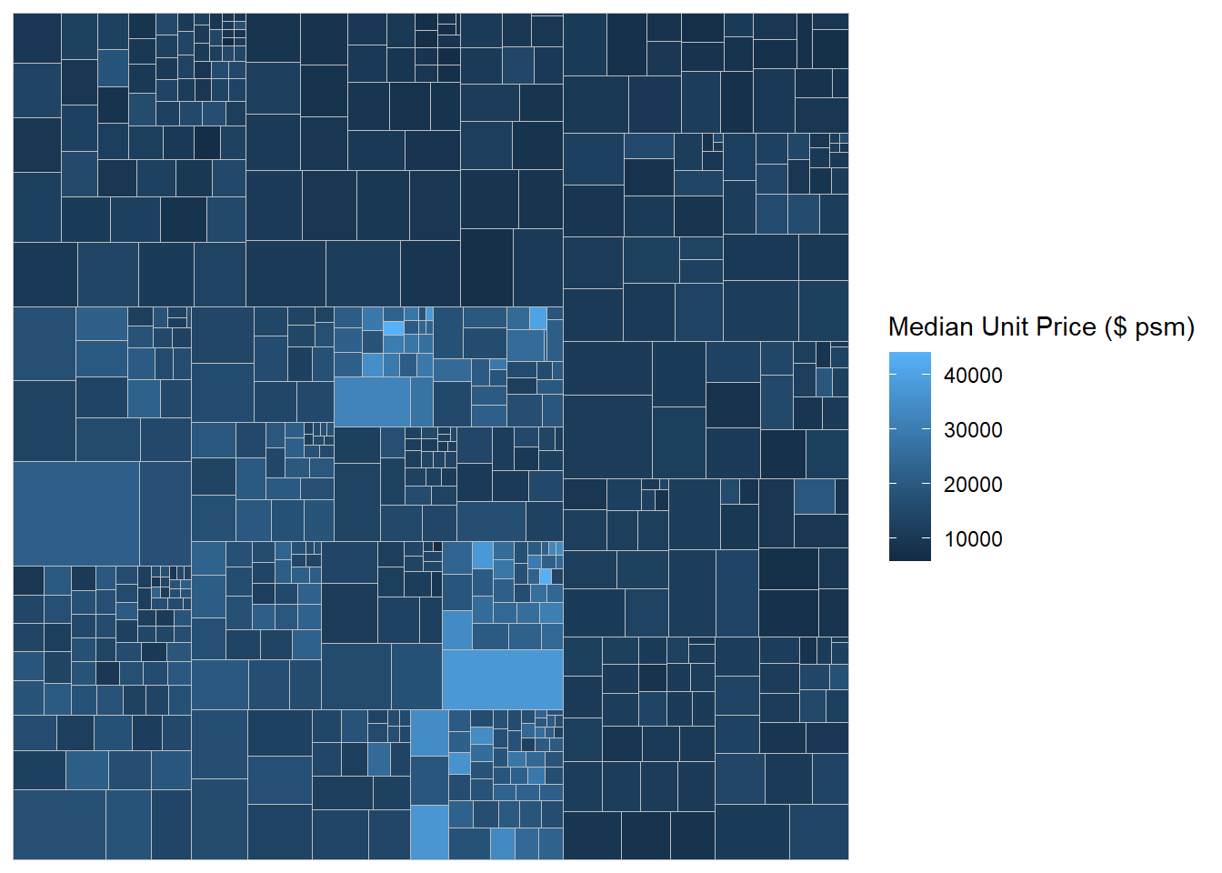 - The rectangles are coloured with different intensity of green, reflecting their respective median unit prices.